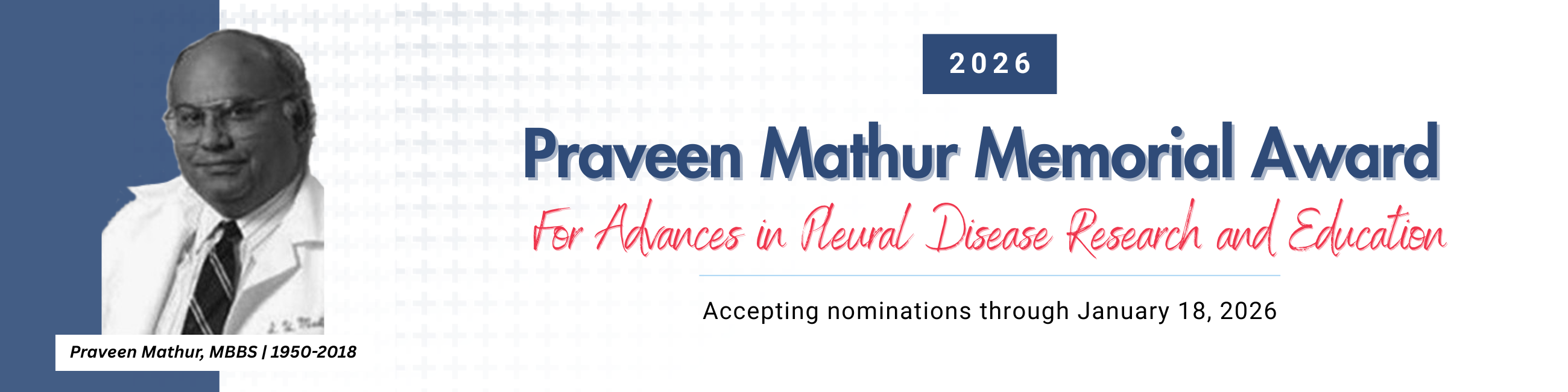 The Praveen Mathur Memorial Award honors the legacy of Dr. Praveen Mathur, recognizing physicians who have made substantial contributions to pleural disease research and education. This award acknowledges those who exemplify excellence, innovation, and dedication in advancing the understanding and treatment of pleural conditions. Recipients of the award will be invited to present at the AABIP Annual Conference in Denver, Colorado, August 20-22, 2026.