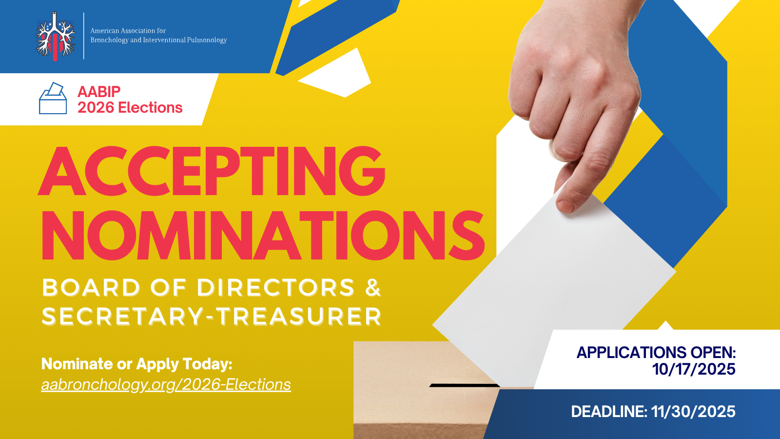 It is with a heavy heart we acknowledge the passing of a dear distinguished colleague and past President of the AABIP (1995-1997) Dr. Paul Kvale. See full AABIP Statement here. EDUCATION & TRAININGTwice-yearly, the AABIP hosts a scientific symposium, and provides various courses, webinars, and seminars to help further education and training. READ MOREIP FELLOWSHIPIP Fellowship programs are a part of the National Residency Match Program. A list of fellowship programs is provided as a service to our members. READ MOREBOARD CERTIFICATIONThe AABIP established a certification process in an effort to improve the quality, consistency and scientific rigor within the field of Interventional Pulmonology. READ MOREJOURNALThe Journal of Bronchology and Interventional Pulmonology is indexed on Index Medicus. For the latest journal entries, click below. READ MORE |