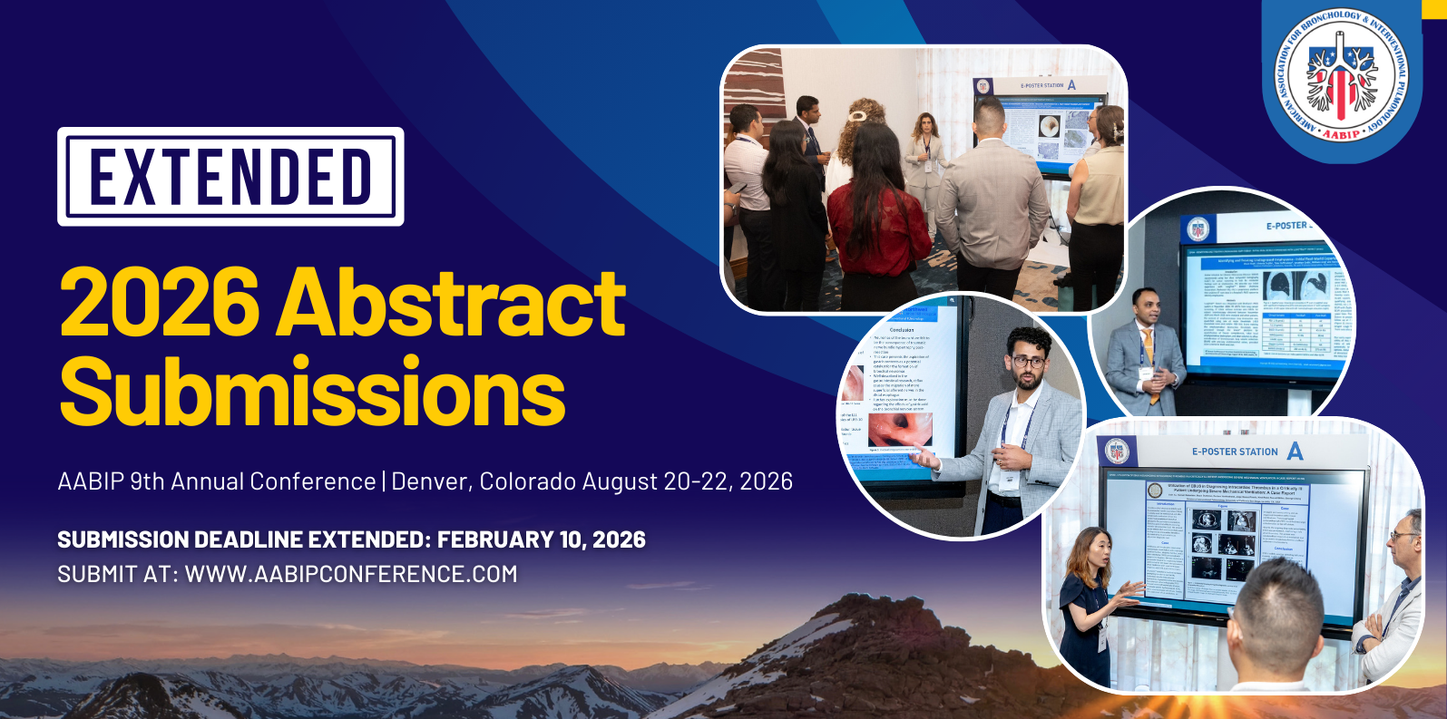 The American Association for Bronchology and Interventional Pulmonology (AABIP) is calling for scientific abstract submission for its annual meeting to be held August 20 to 22, 2026 in Denver, Colorado. The premier conference for interventional pulmonologists, advanced bronchoscopists, pleural experts and other interested health care professionals aims to gather leading clinicians, scientists, and educators to exchange ideas and discuss research on all aspects of Interventional Pulmonology and Advanced Bronchoscopy. It also provides an ideal platform for all participants to present and discuss the latest technologies, research trends, as well as practice innovations to advance the field and better patient care.