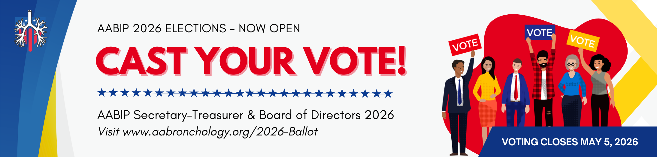 Each of these highly qualified candidates have been placed on the ballot based on their clearly demonstrated leadership, commitment to service to the AABIP and Advanced Bronchoscopy and Interventional Pulmonology in general. Your vote is crucial to shaping the leadership and vision of our organization, so please take the time to consider each candidate carefully and make sure your voice counts. The election results will be announced at the 2026 AABIP Annual Conference, and the elected members will begin their 2-year terms beginning in August 2026. >> Review Candidate's Statement of Interest AABIP Bylaws UpdateThe AABIP Board of Directors is presenting a proposed update to the Association’s bylaws for member review and vote. These revisions are intended to align the bylaws with the Association’s current structure, operations, and standard operating procedures. Review the Proposed Revisions